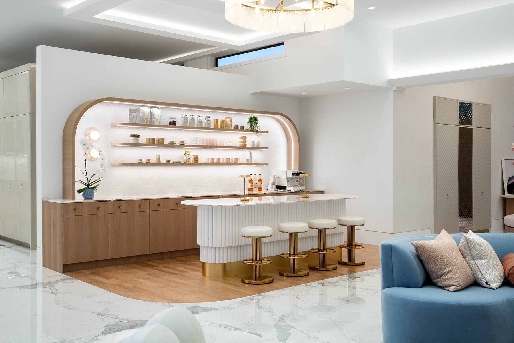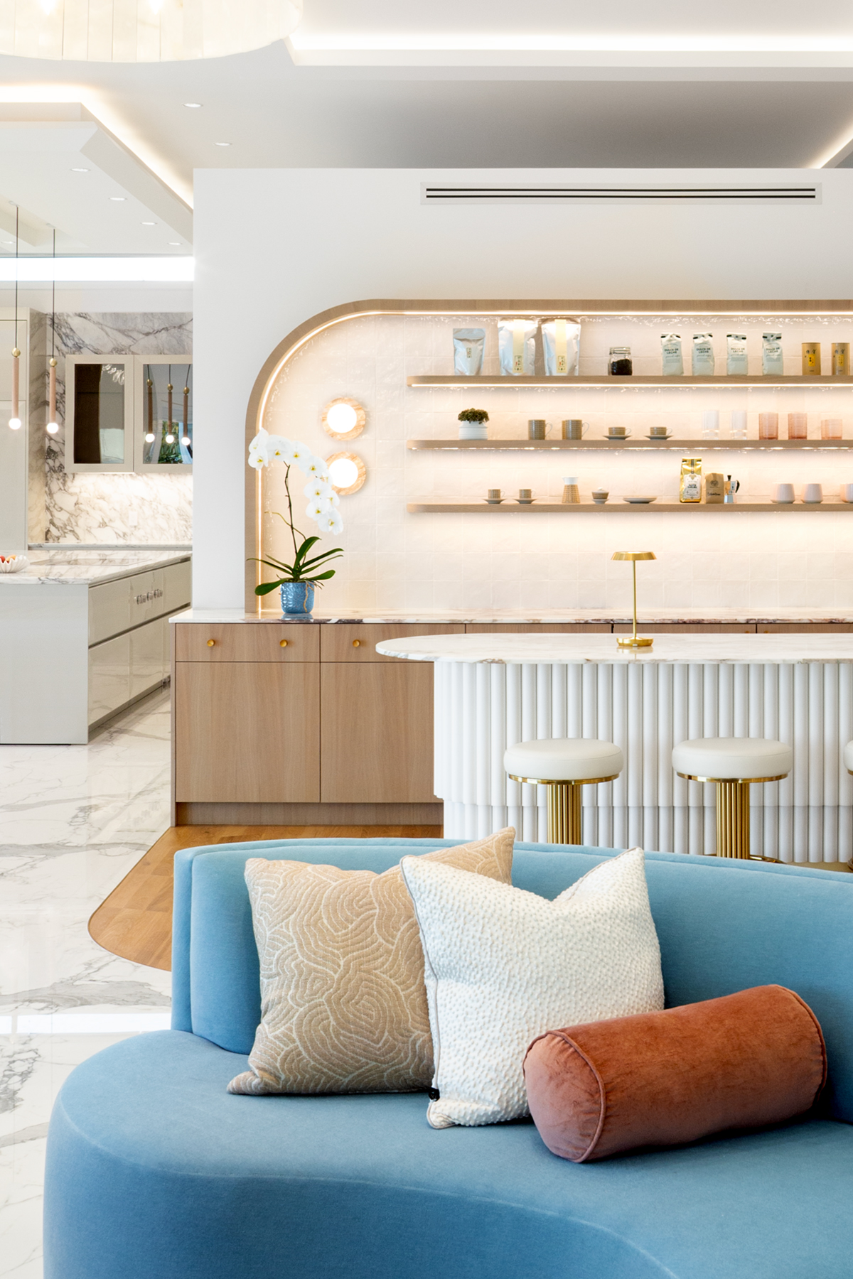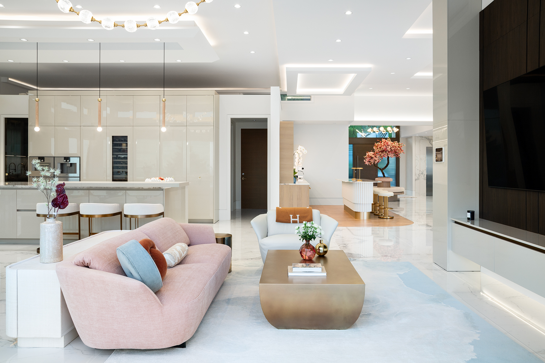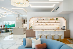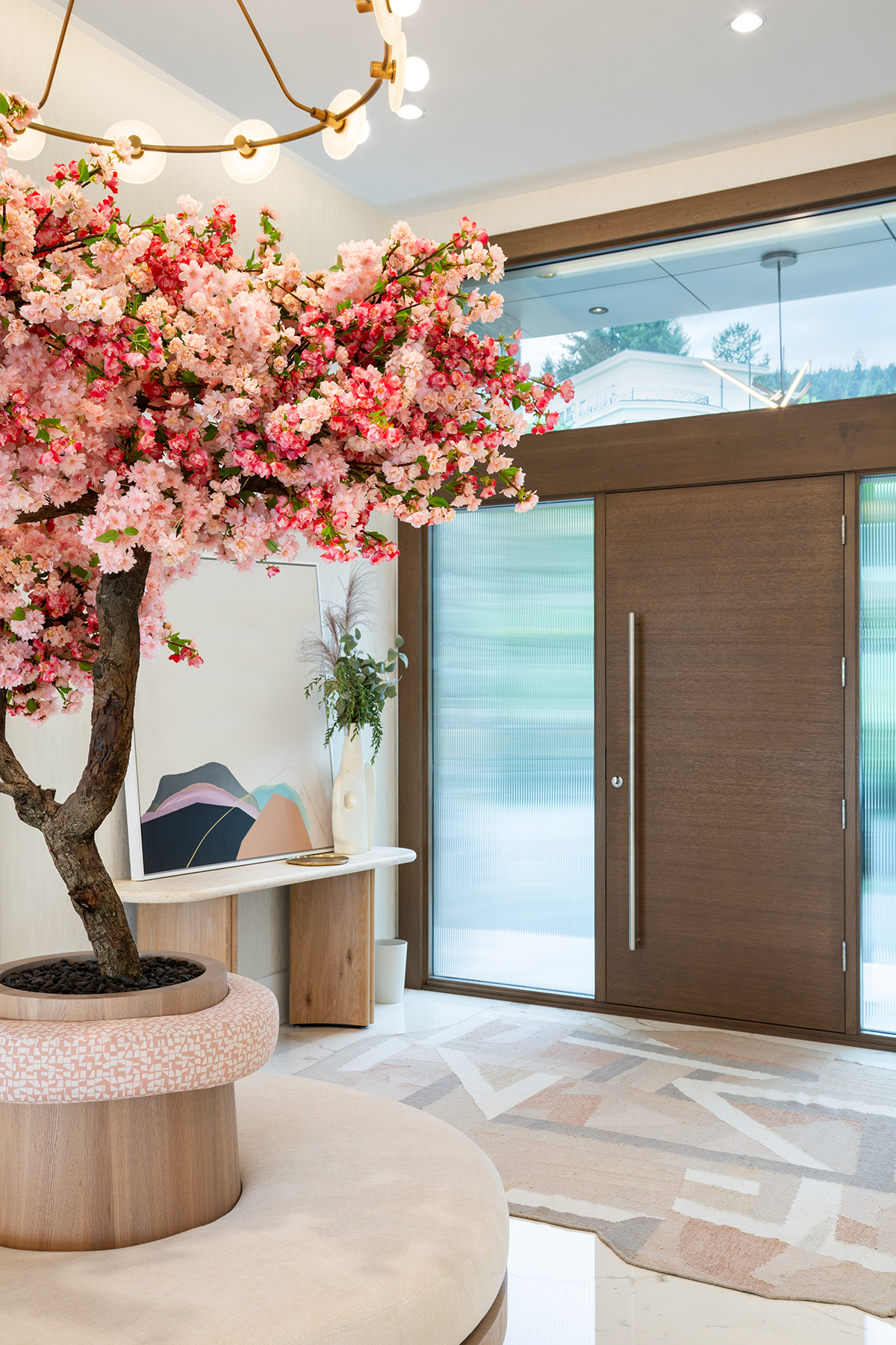 A former dining nook became a coffee shop-inspired bar, pink-and-white marble, and curving oak features corners. The vast entry gained purpose with a round bench centered under a blooming cherry tree—welcoming guests and anchoring the space.