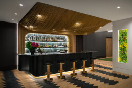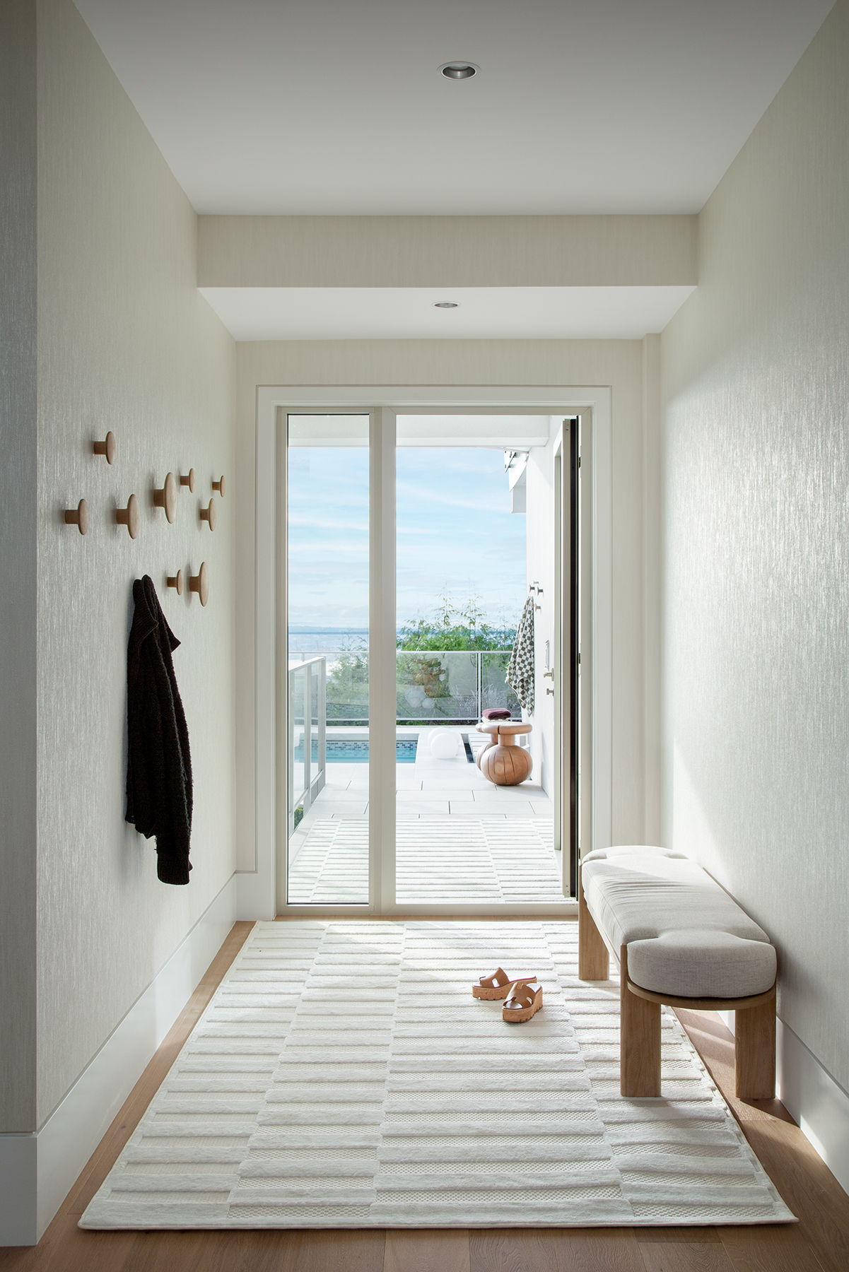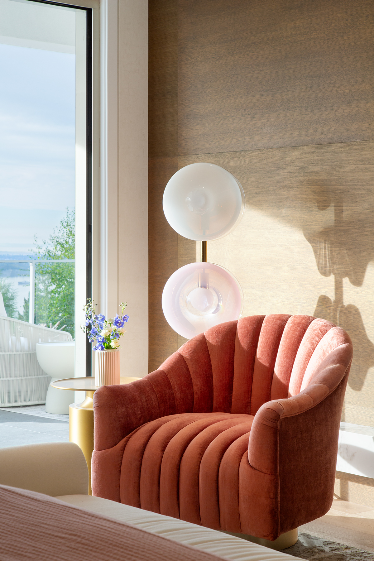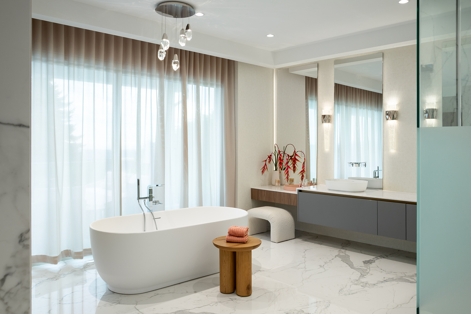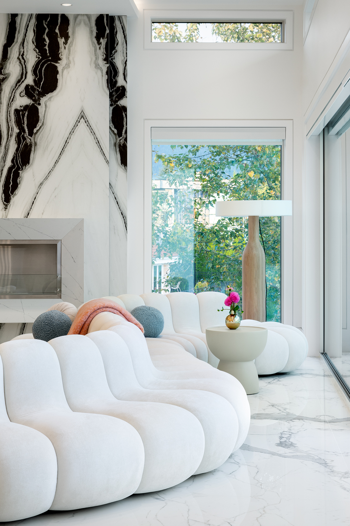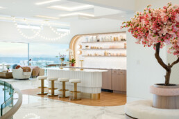 A former dining nook became a coffee shop-inspired bar, pink-and-white marble, and curving oak features corners. The vast entry gained purpose with a round bench centered under a blooming cherry tree—welcoming guests and anchoring the space.