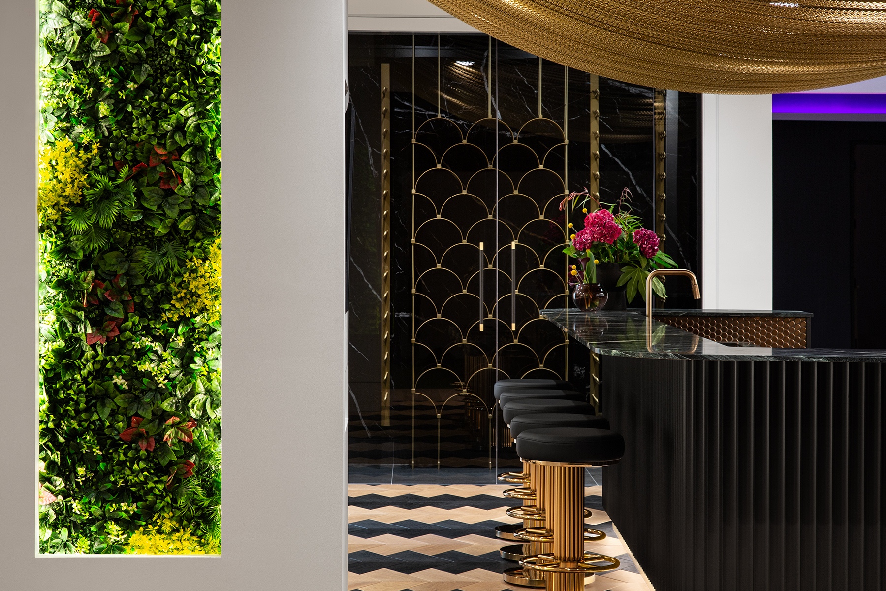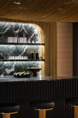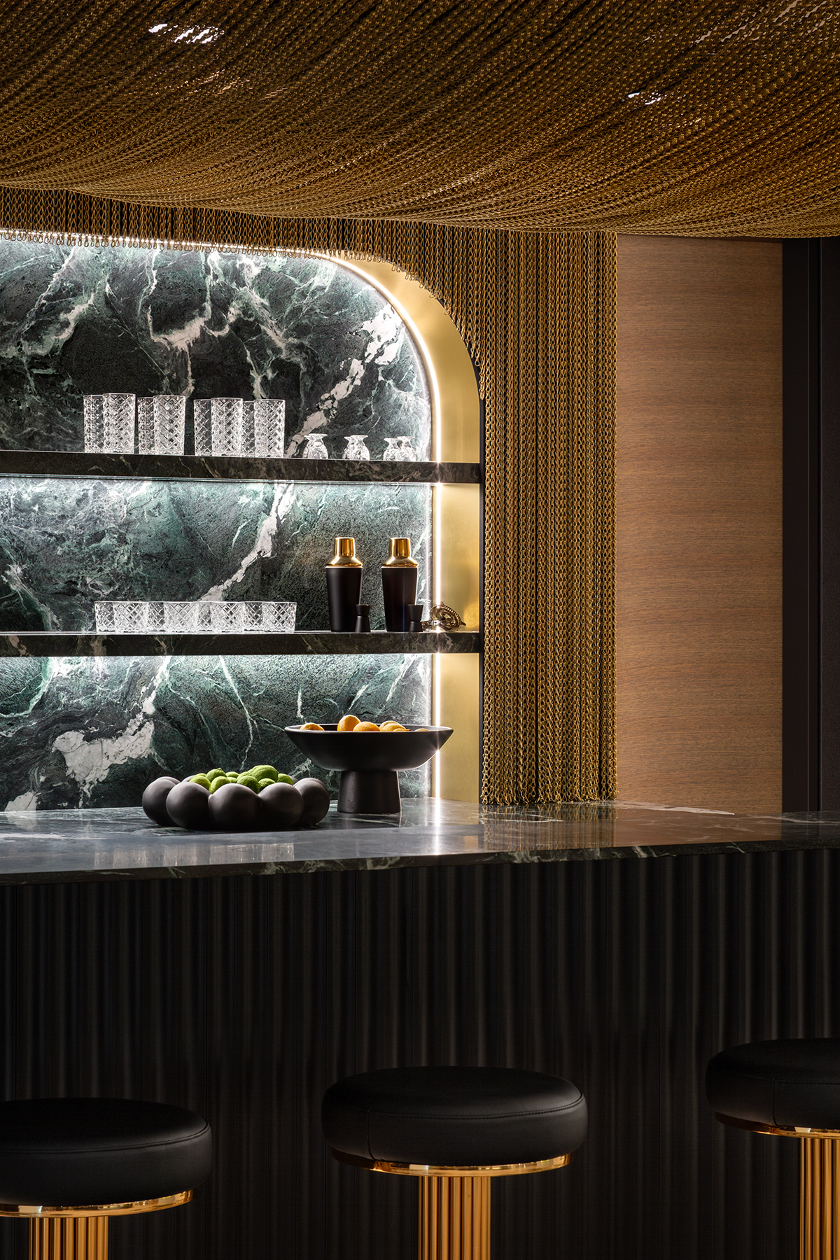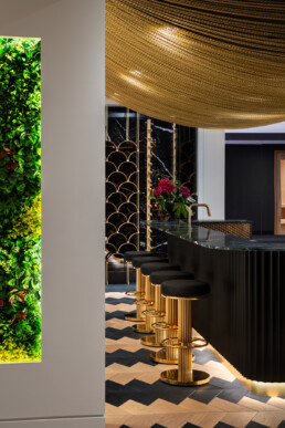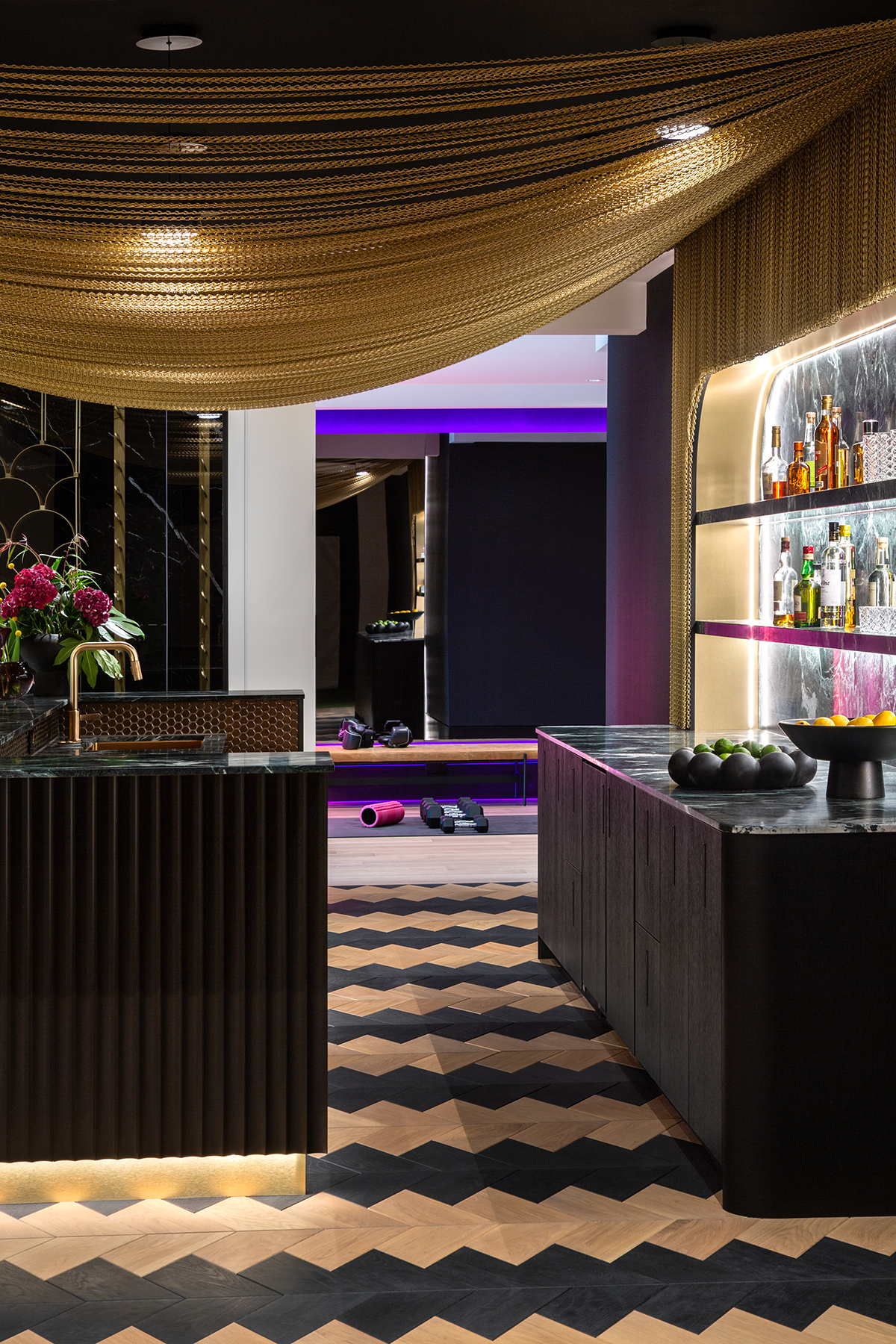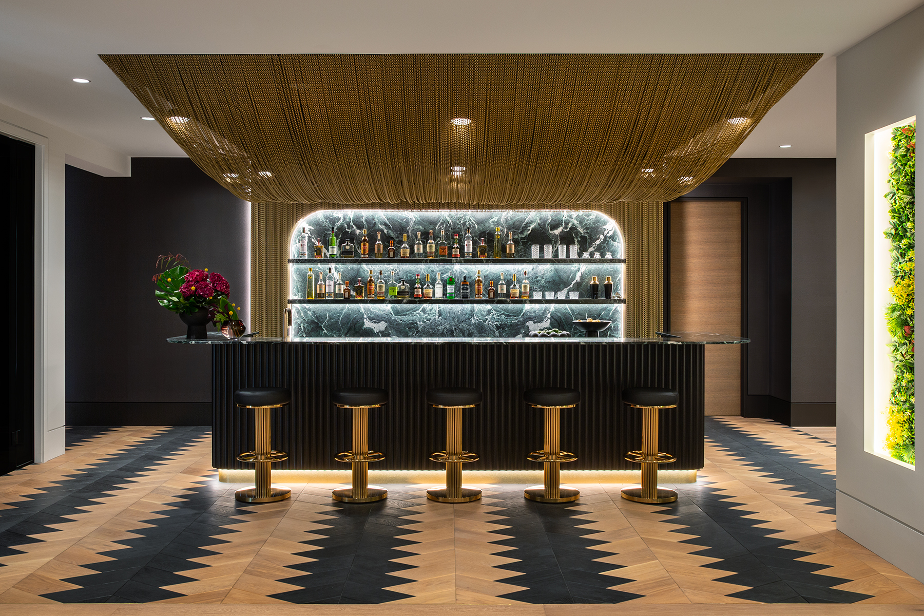 Downstairs, the bold lower bar features patterned oak floors, deep green marble, black-and-gold accents, and a one-of-a-kind gold chain canopy. Fully equipped for epic hosting, it boasts beverage fridges, an ice maker, custom shelving, and a dramatic bottle display.