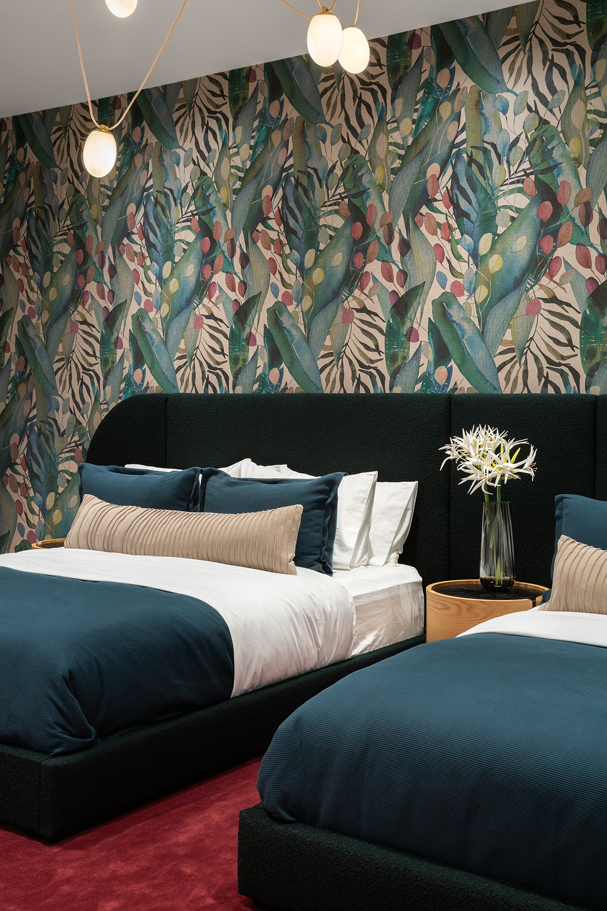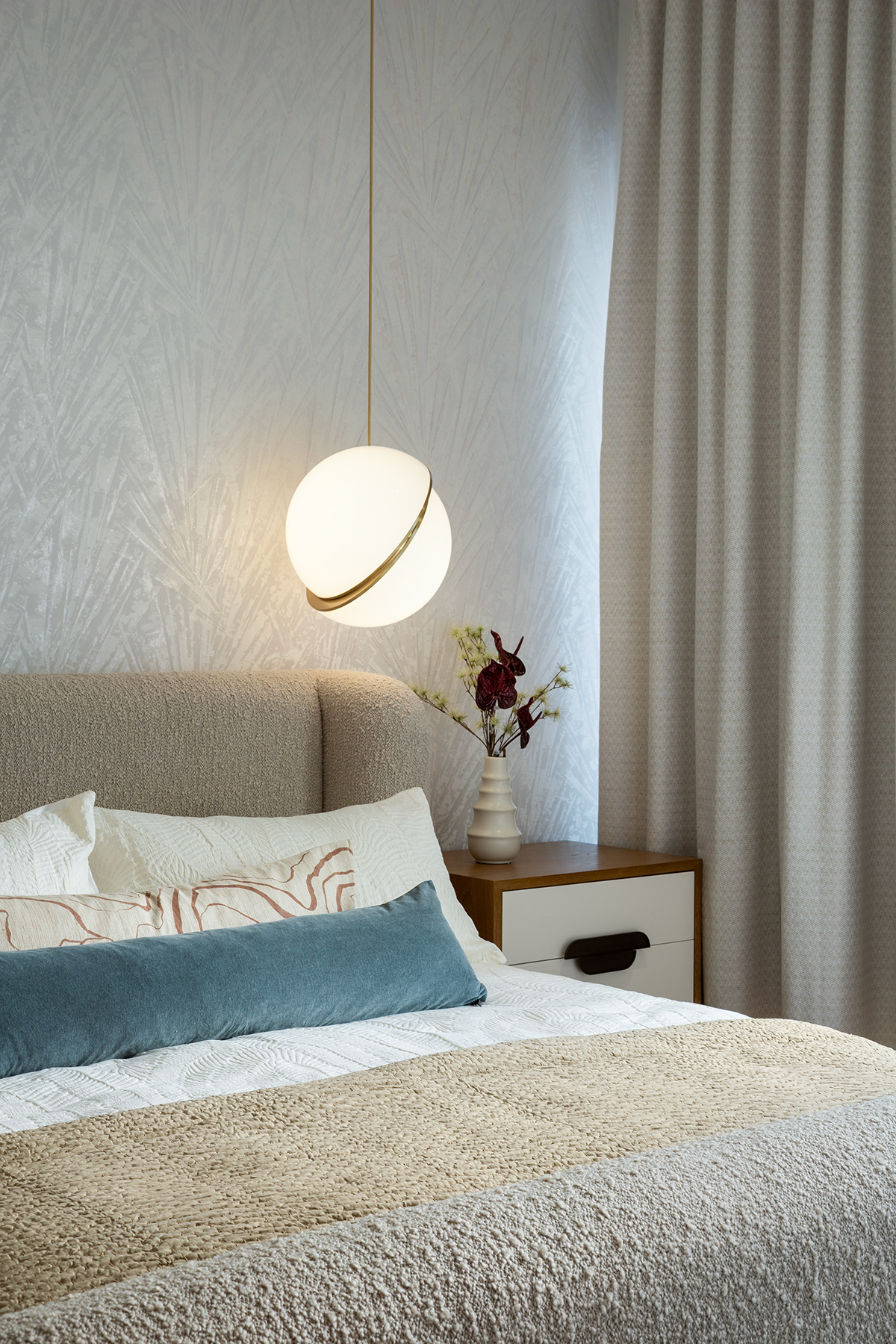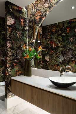 Lighting and wallpaper choices transformed the home’s personality—statement fixtures, eye-catching patterns, and Moooi’s “Menagerie of Extinct Animals” wallcovering bringing jungle energy to the powder room. Layered, functional, and sometimes daring, every piece was curated to grow with the family.