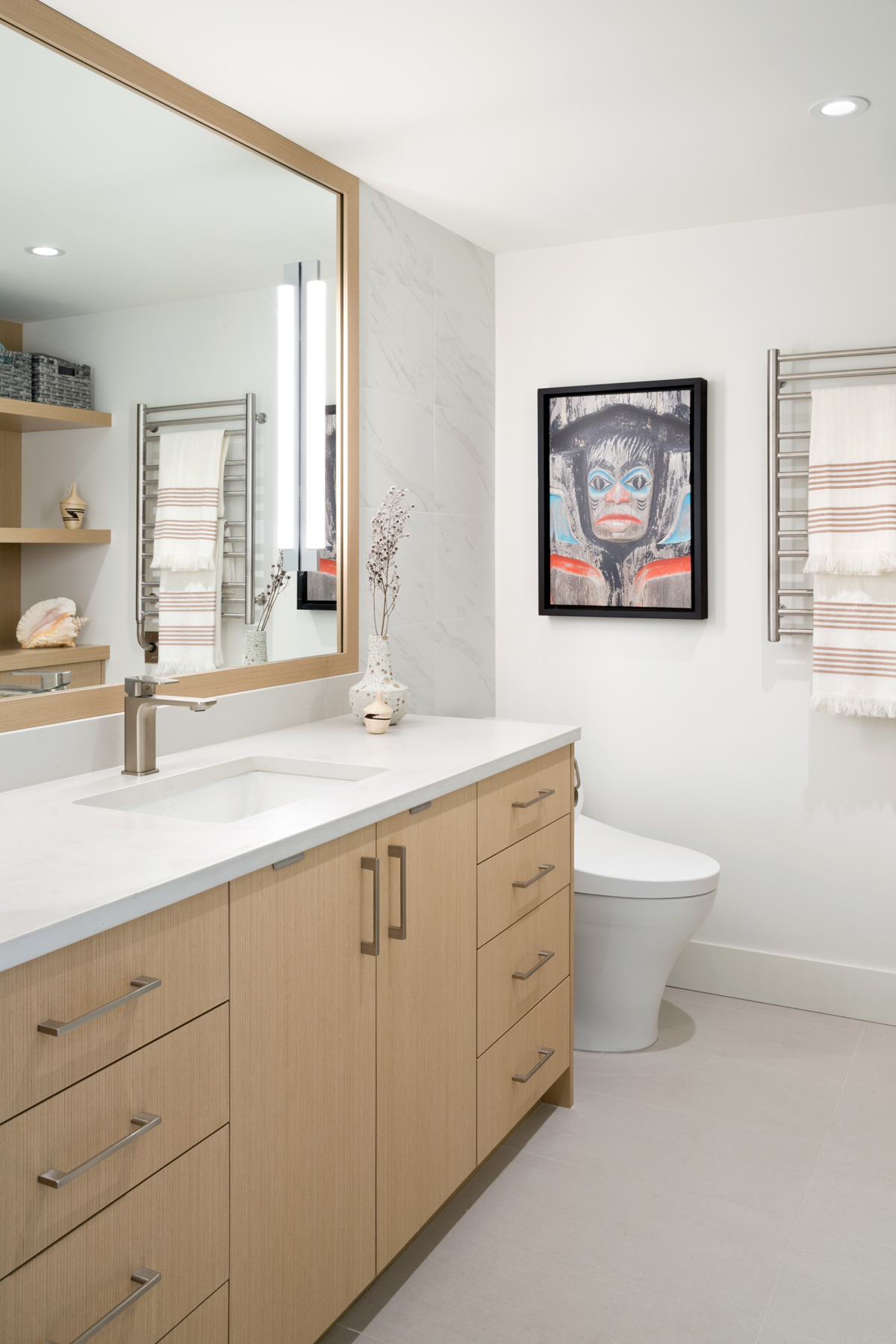 This tired condo needed an update to be on-par with its unbeatable views! This project came to us from a previous client who is planning for retirement. We chose a neutral palette of creams, whites, and oak which became the perfect backdrop for our client’s personal artifacts she has gathered from years of travel around the globe. The solarium space was converted into a larger kitchen with complementary office space the best view in the house! A linear textured tile re-clad the existing fireplace, a Frame TV was installed above it to display art when not in use, while the ledge below provides another opportunity for display. The primary bath was designed with aging in place in mind. It originally had a small shower and a bathtub. A larger curbless shower was installed in its place, the remaining space was used for a nook to display treasures, towels and keep laundry hidden in a custom-made cabinet. Our scope for this project ranged from initial concept, through permit submission, all the way to art installation. To see the before images, please visit our transformations page.